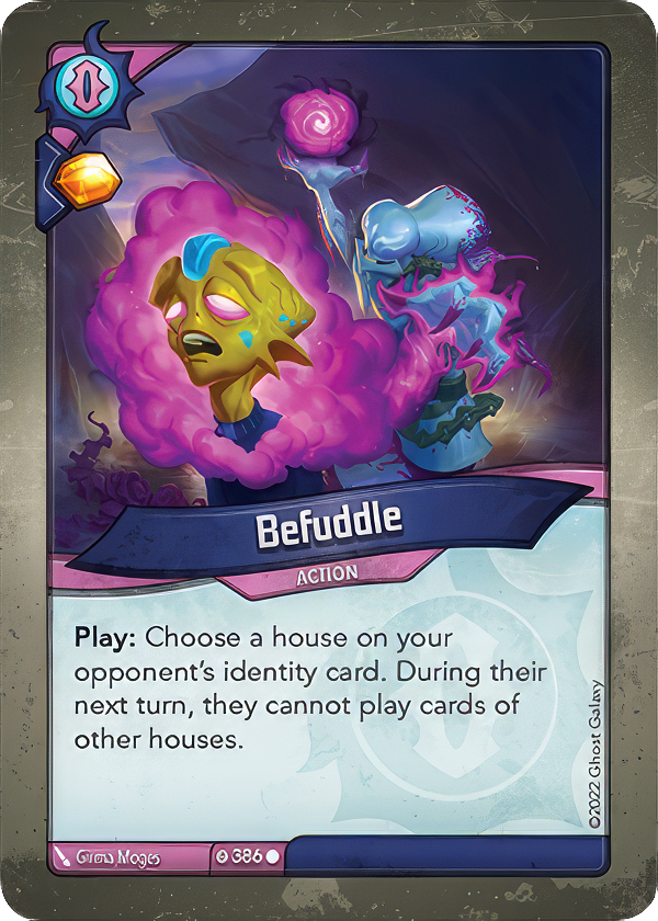Q: On their previous turn, my opponent played Befuddle, choosing Logos when the “Play:” ability resolved. On my turn, can I play a Logos card that has been enhanced with a Geistoid house bonus icon?