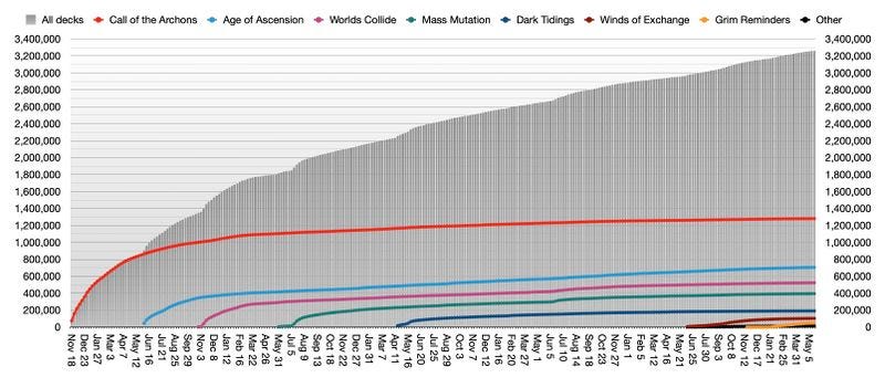 As of May 19, 2024, a total of 3,262,336 decks were registered in the Master Vault. This reflects an increase of 2819 decks in the last week.