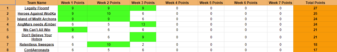 ABR Season 11 is in progress. After almost three weeks, the standings are as follows: